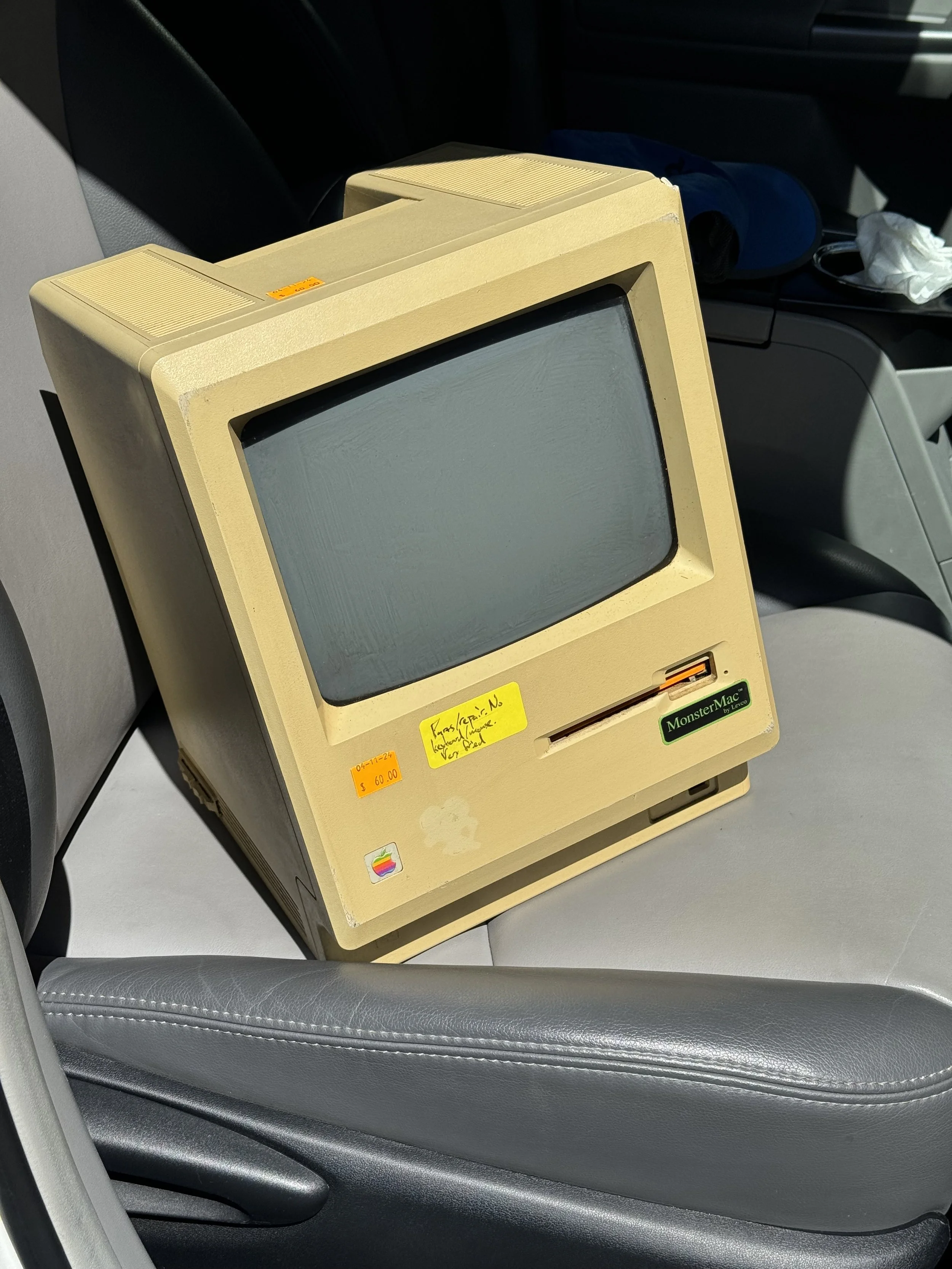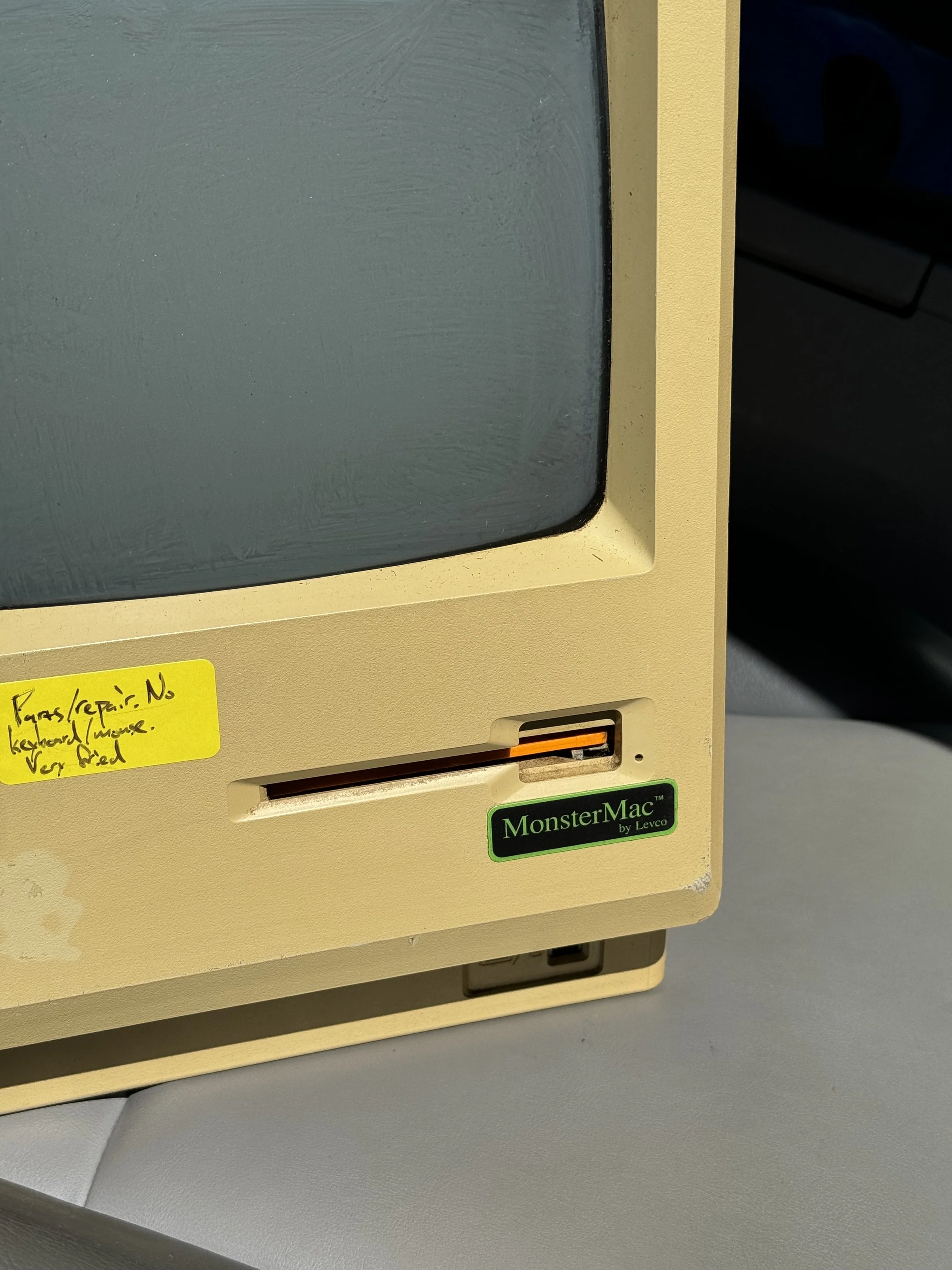 HOWEVER. When Huxley spotted this lonely old Mac, one detail in particular made it a “must buy:” the “MonsterMac by Levco” sticker on the front of the machine.