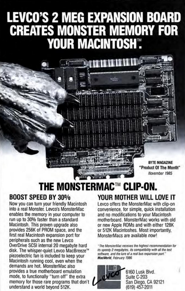 This magazine ad for the Levoco MonsterMac leans into the monster-theme while highlighting its impressive technical specs.