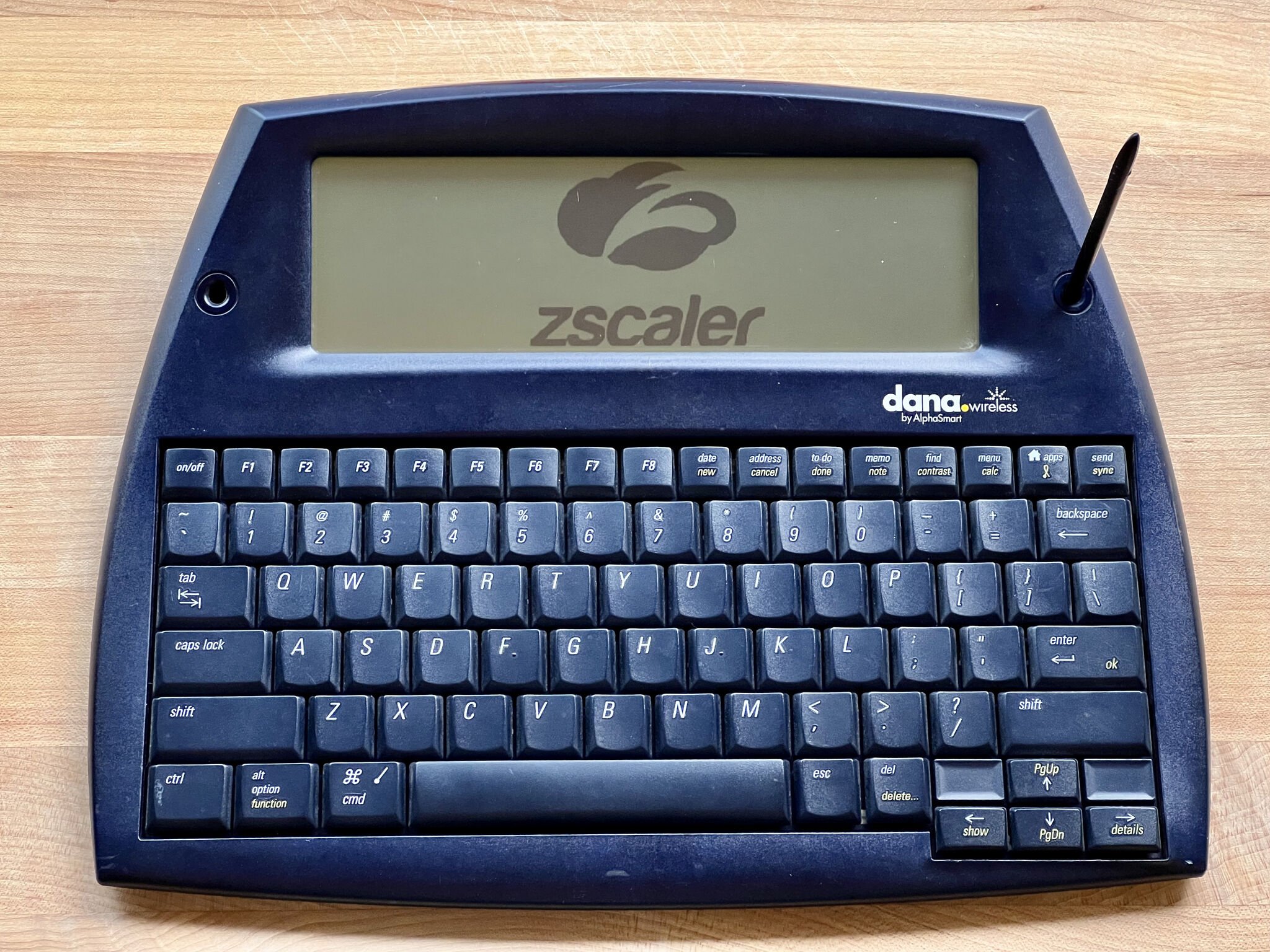 Hi everyone! For 2022’s first entry in my never-ending “Zscaler Logo On A Weird, Old or Otherwise Oddball Gadget” series, I’m skewing deep into “oddball” territory: the AlphaSmart Dana Wireless from 2003. This was the final model in a long series of AlphaSmart devices, which were mostly (though not exclusively) sold to schools in the era when the benefits of students having a laptop were clear, but the cost of every student having a laptop was unrealistic for many school districts. To solve this problem, AlphaSmart made a line of these “slab-tops” - small, rugged, relatively-inexpensive, low-powered computers which were great for word processing, scheduling and other basic tasks.