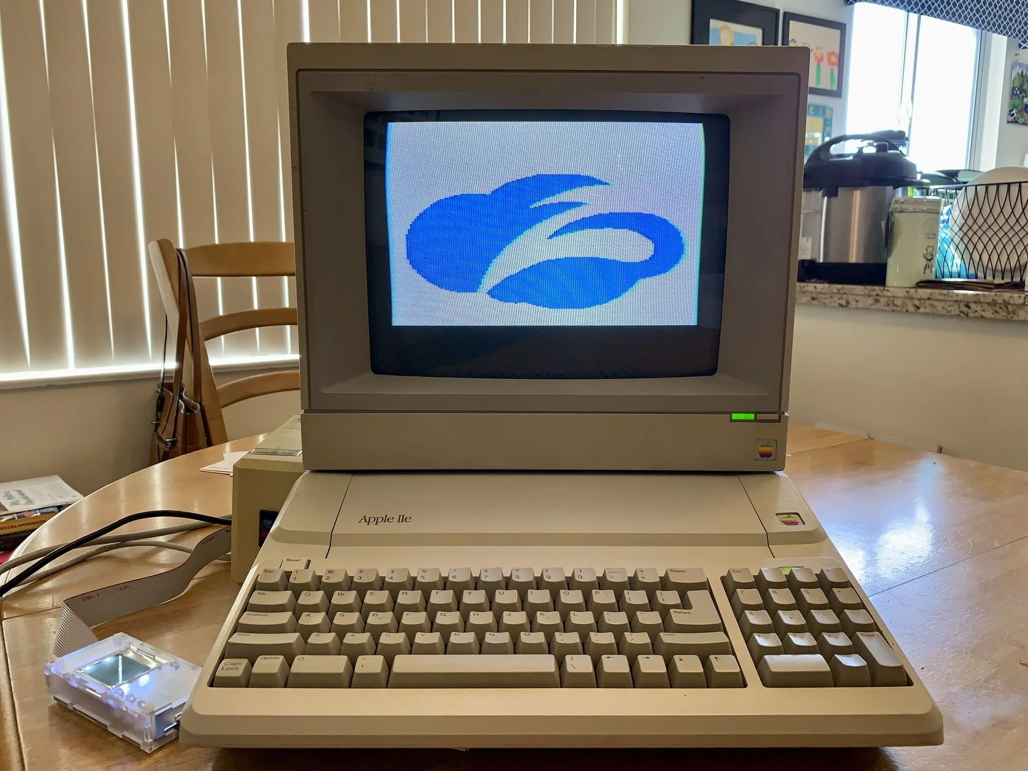 Getting the logo to display on this 8-bit computer took some work. I used some modern software to convert the logo to a “Double Hi-Res” bitmap graphic, then used another modern app to create an AppleDOS disk image file with the logo bitmap and a simple image-viewing app pasted into it, copied that disk image file to a microSD card. Once the image and app were on the microSD card, I then used the little translucent gadget you can see to the left of the keyboard (a “Floppy Emu”) to mount the microSD card onto the Apple so it could load the disk image and display the graphic. Fun!